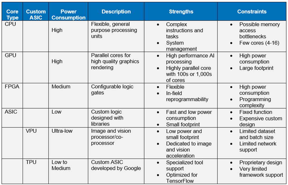 Table 1: Comparison of AI/ML processing hardware. (Source: Mouser Electronics)