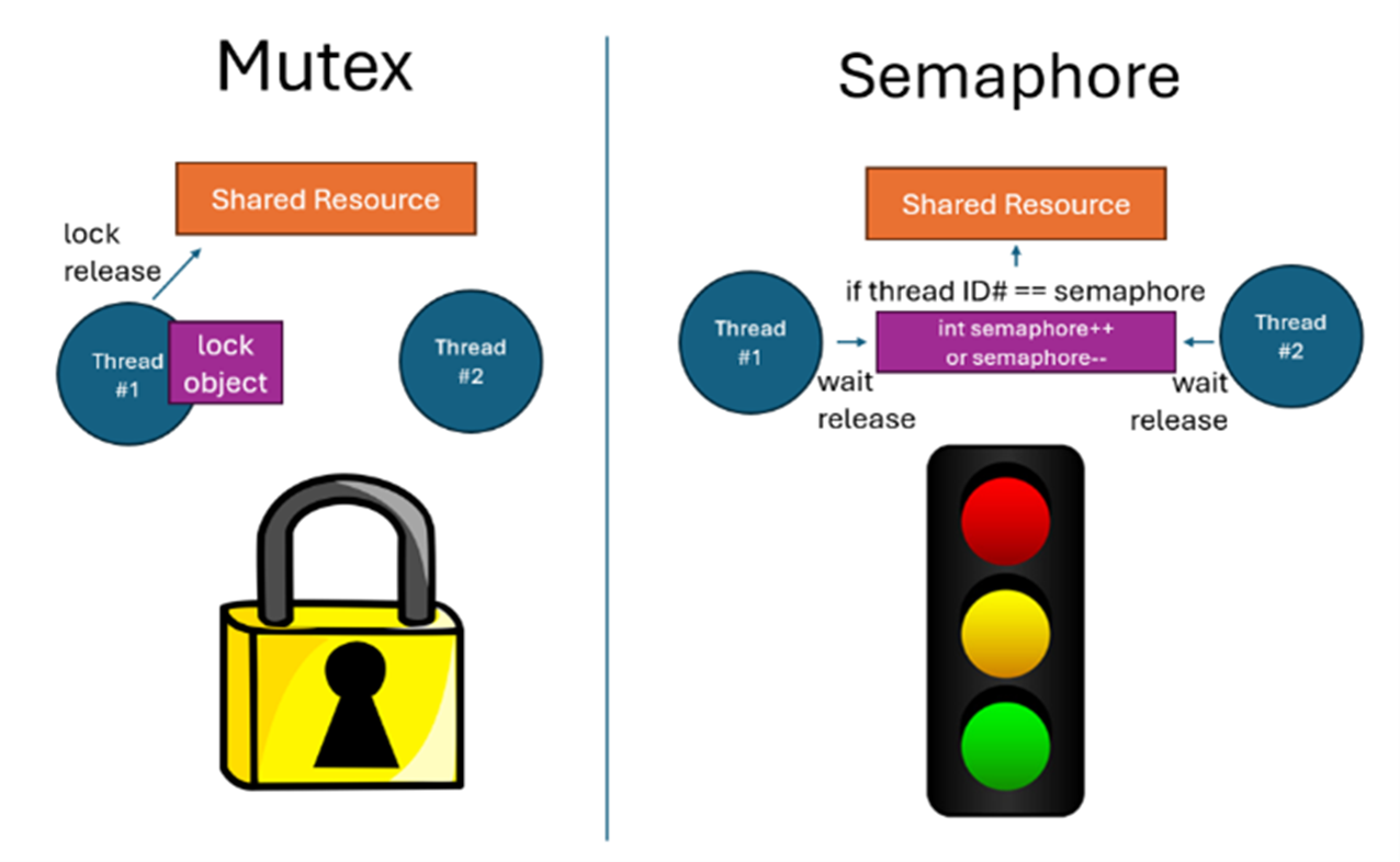 Figure 1: Mutexes are object-based and can be thought of as passing a key to a locked shared resource. A semaphore is based on an integer counter and can be thought of as a stoplight to control access. (Source: Author)