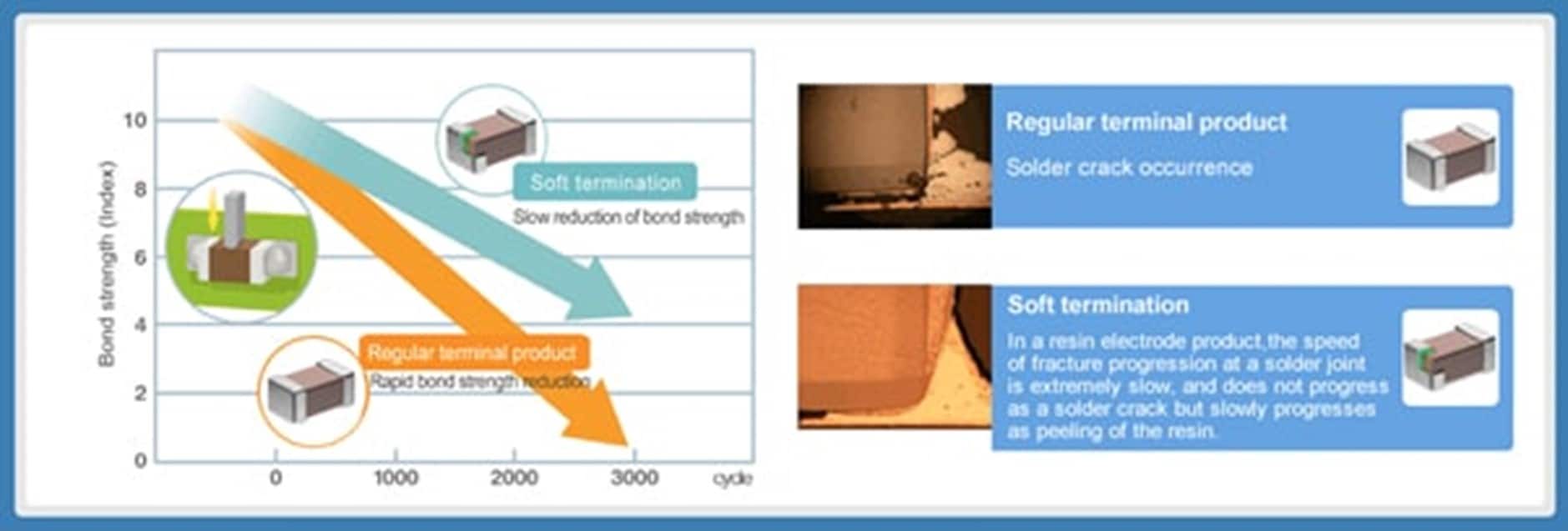 In order to meet these safety requirements, components with plastic electrodes—which are also known as "soft termination"—are used to reduce two common sources of error: bending and soldering cracks. In this blog, we explain how these errors can be avoided by "soft termination."