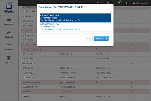 - Länka produkter i ditt lager till Mousers artikelnummer för enkel återbeställning
